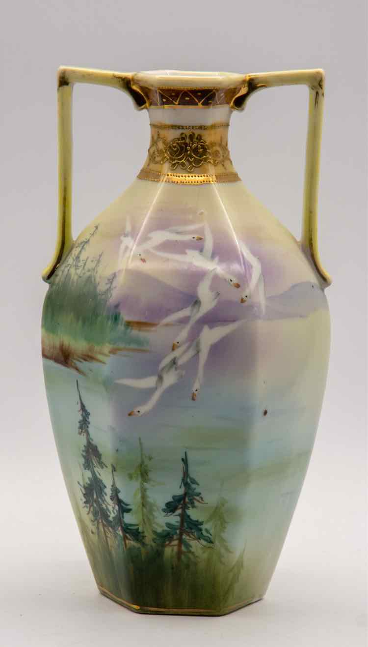 Painted Asian Vase w/ Gilded Gold Rim 9"